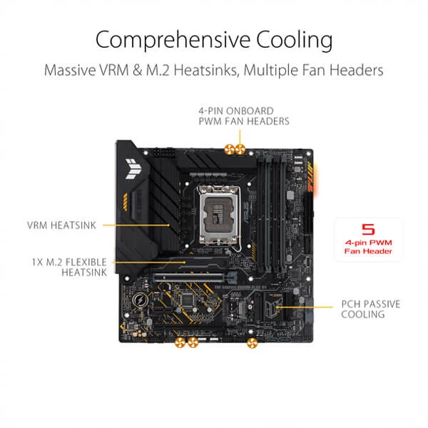 Intel® B660 (LGA 1700) mATX motherboard, 10 1 DrMOS Power stages , PCIe 5.0 support, DDR4 5333 (OC), Dual PCIe 4.0 M.2 Slots with Flexible Heatsink, Realtek 2.5Gb Ethernet, Rear USB 3.2 Gen 2×2 Type-C®, Front USB 3.2 Gen 1 Type-C®, Aura Sync, Two-way AI Noise Cancelation
