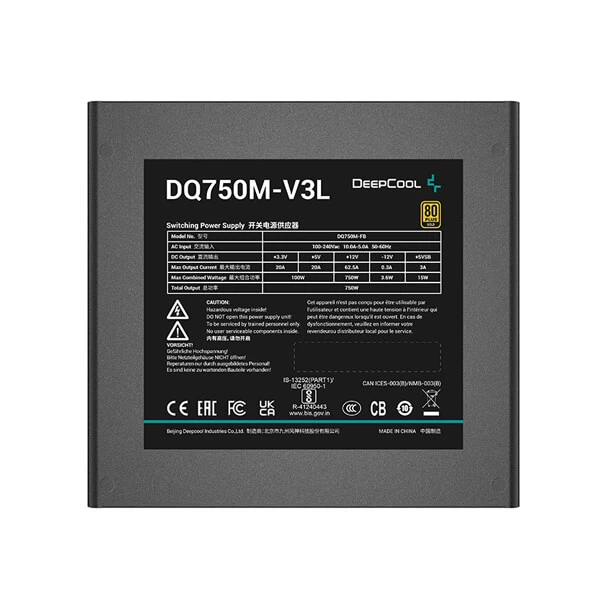 The DeepCool DQ750M-V3L is a fully modular power supply that adopts a new pure black shell, is 80 PLUS gold certified, utilizes a mainstream active PFC + full-bridge LLC resonance + DC/DC architecture, and uses all Japanese capacitors. The power output is stable and efficient, making it an excellent choice for AAA games.