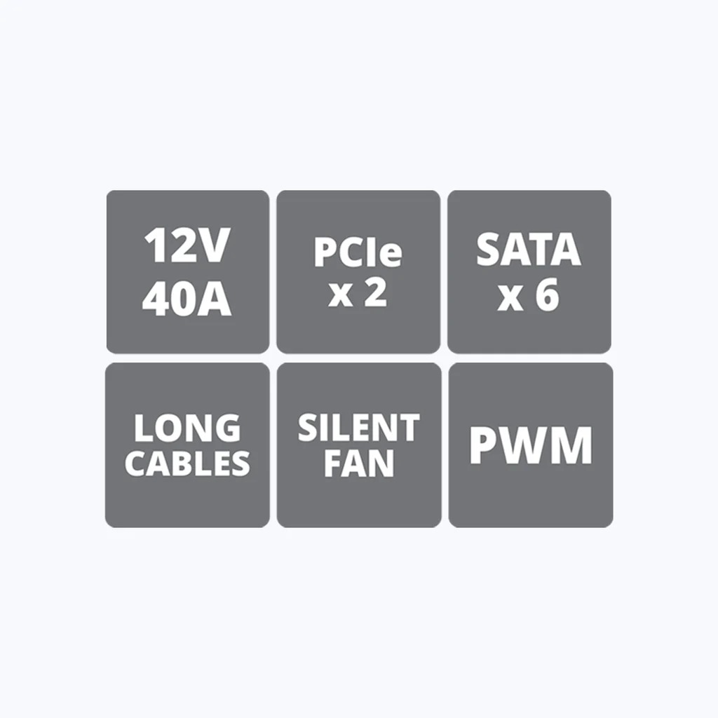 Presenting our new certified Gaming Power Supply.This Product is a 12V 40A Single rail Power supply that comes with extra long cables. The power supply is designed with active power factor correction for better efficiency.